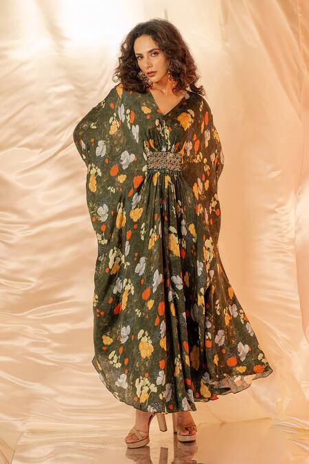 Green Embroidery V-neck Floral Kaftan Dress