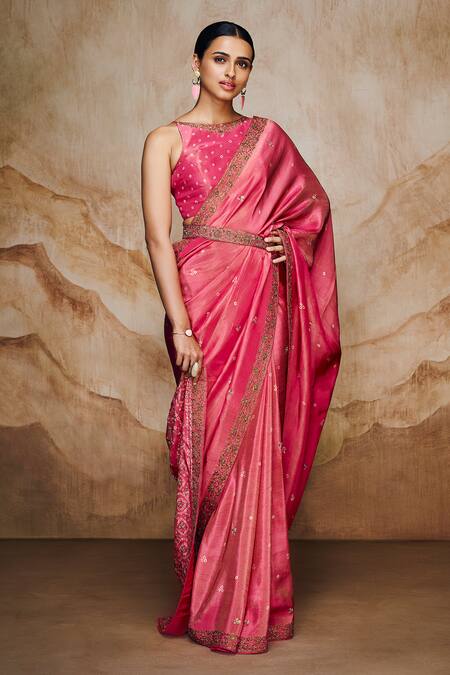 Pink saree featuring bandhani placement woven motifs and a contrast embroidered border. Paired with a boat neck sleeveless padded blouse made from velvet.