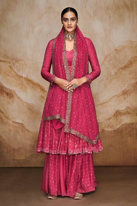 Pink Cotton, Silk, Viscose, Organza Bandhani Print Anarkali Sharara Set
