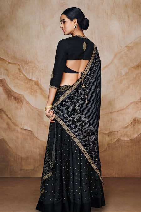 Black lehenga featuring all-over butti bandhani print and embroidered waistband. Paired with a leaf neck padded blouse and a gajji printed dupatta with floral zari and thread embroidery.