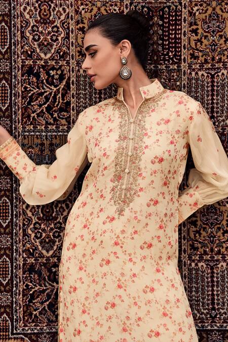 Ivory kurta featuring floral print with sequins hand embroidery. Paired with a matching pant and dupatta in viscose organza.