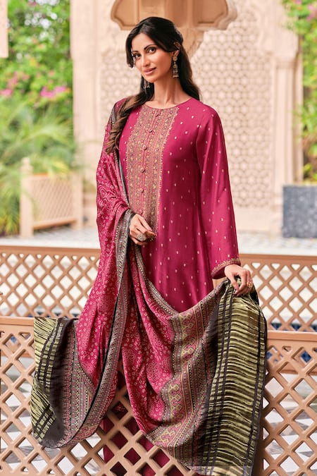 Rouge red kurta featuring floral and thread embroidery with a round neckline. Paired with a pant and an ajrakh printed dupatta.