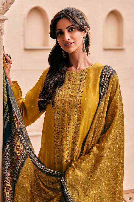 Mustard kurta featuring floral and thread embroidery with a round neckline and three-quarter sleeves. Paired with a matching pant and an ajrakh printed dupatta.