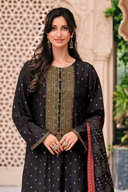 Black kurta featuring floral and thread embroidery with a round neckline and three-quarter sleeves. Paired with a pant and an ajrakh printed dupatta.