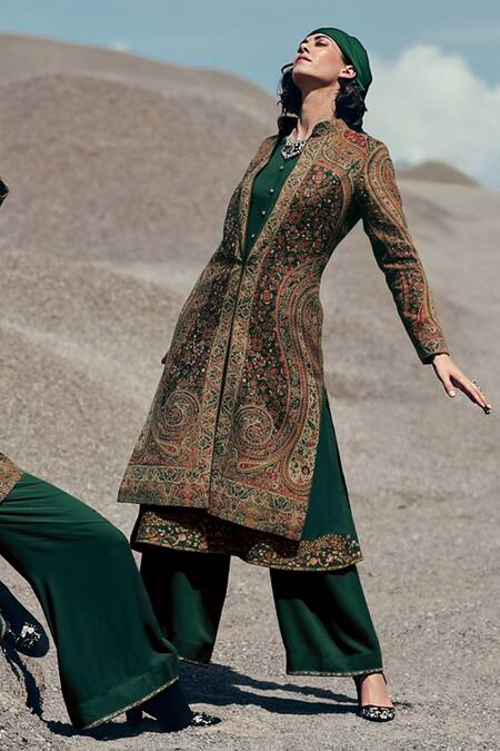 Bottle green kurta featuring paisley and floral embroidered hem. Paired with a woven thread weave jacket, palazzo, and scarf.