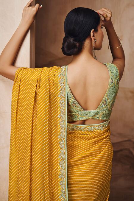 Yellow saree featuring stripe print with floral embroidered border. Paired with a mughal embroidered padded blouse and belt.
