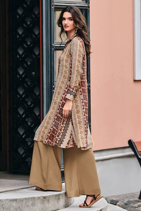 Brown printed tunic featuring a spread collar and full sleeves, paired with wide legged pants. The tunic has a front button closure and a relaxed fit, made from viscose woven muslin, while the pants are crafted from viscose shantoon.
