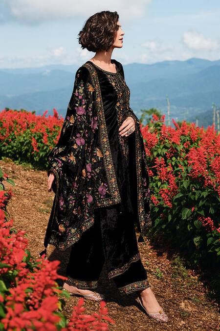 Black velvet kurta featuring a round neckline and full sleeves with Parsi embroidery on the placket. Paired with a pashmina pant and a tasselled dupatta adorned with floral embroidery.