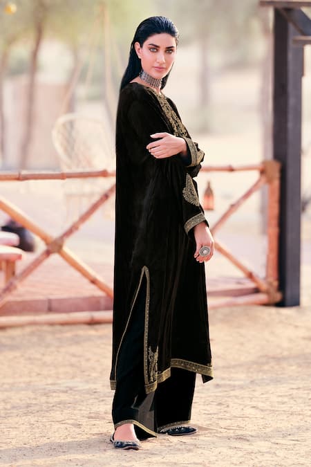 Black velvet pheran featuring round neck, bell sleeves, and embroidered borders. Paired with viscose pashmina pants with an elastic waistband and embroidered border.