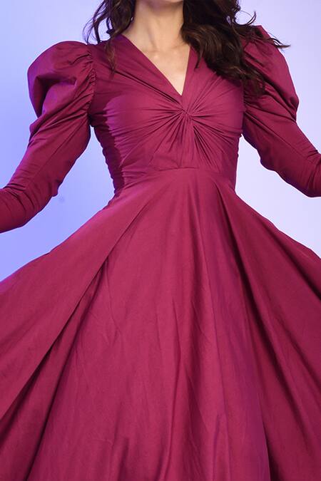 Purple cotton satin gown featuring a V-neckline and leg of mutton sleeves