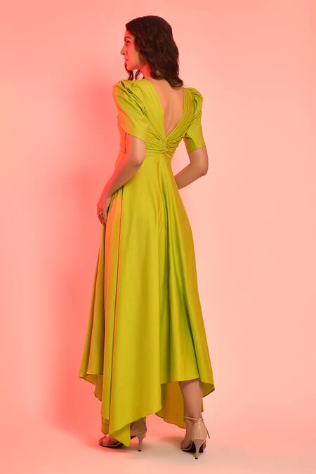 Lime green cotton satin gown featuring a V-neckline and petal sleeves