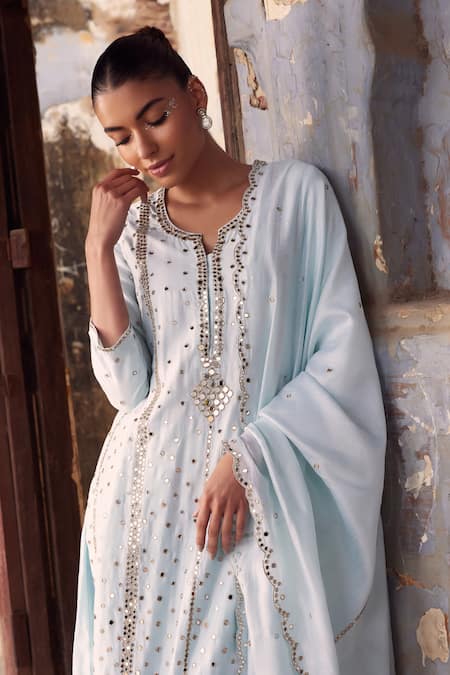 Aqua blue straight kurta featuring mirror and gota embroidery with a tear drop neck. Paired with a palazzo and an organza dupatta adorned with scallop trim and mirror embroidery.