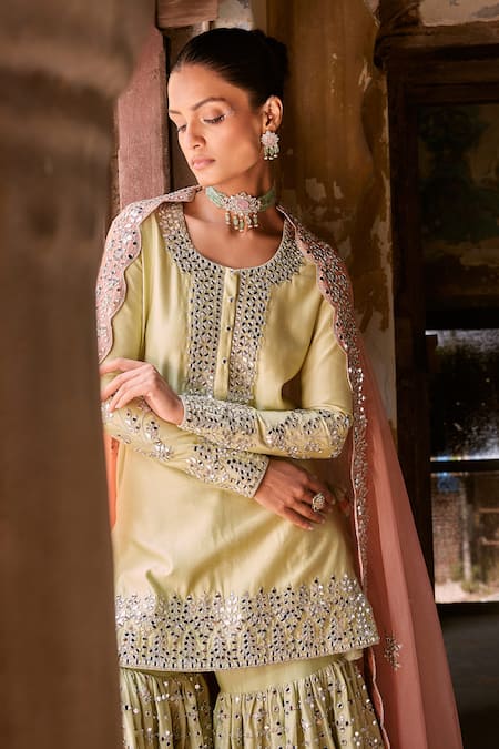 Green kurta featuring gota patti and mirror embroidery, paired with a sharara. Comes with a contrasting dupatta adorned with gota patti embroidery.
