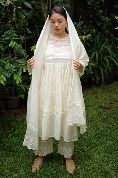 Ivory dupatta made from chanderi cotton silk featuring lace embroidery and paneled edges