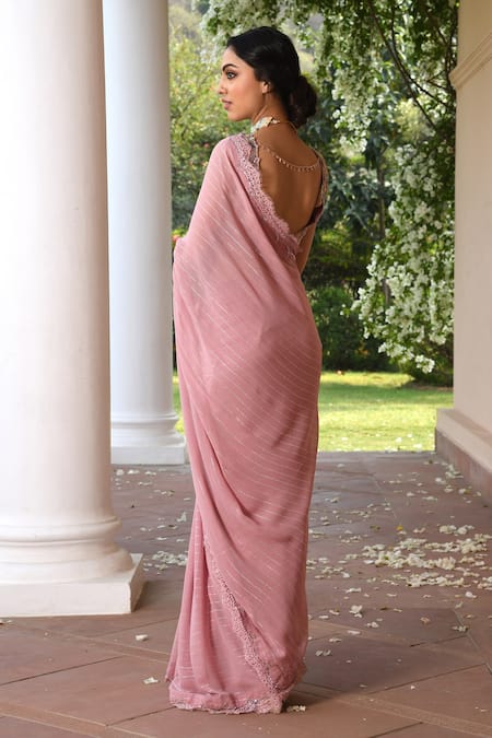 Pastel pink striped saree with crochet lace border. Paired with a floral embroidered blouse
