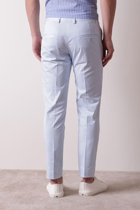 Powder blue trouser made from cotton featuring white piping detailing on the waistband