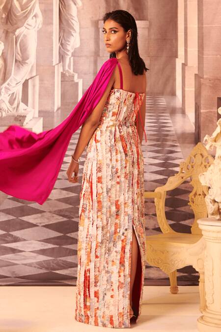 Fuchsia gown featuring an asymmetric neckline, structured stripe pattern, and drape detailing