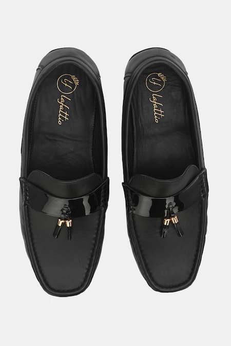 Black leather loafers featuring a matte finish and tasselled detail on the vamp
