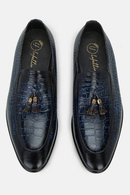 Blue textured moccasin shoes featuring tassel detailing and a shaded base