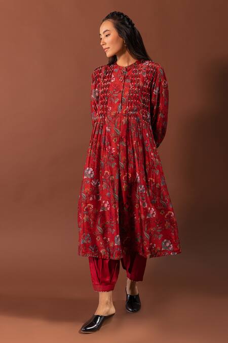Red chanderi floral print kurta with smocked details and pearl embellishments. Comes with inner & pleated pant.