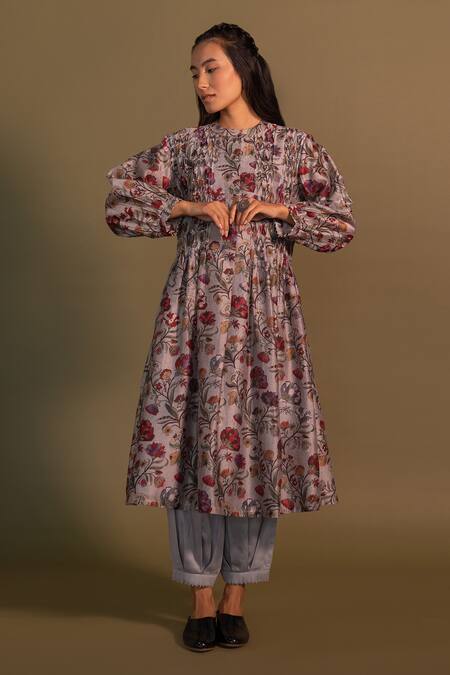 Grey chanderi floral print kurta with smocked details and pearl embellishments. Comes with inner & pleated pant.