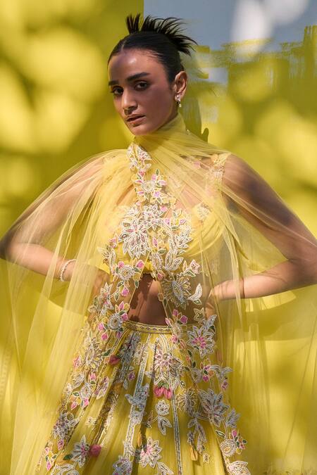 Yellow lehenga featuring floral embroidery with an attached cancan. Paired with a pleated padded blouse and a semi-sheer dupatta adorned with embroidered borders.