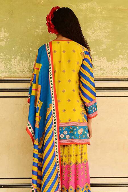 Buy_Swati Vijaivargie_Multi Color Silk Sequins Round Neck Multicolor Floral Geometric Printed Kurta_at_Aza_Fashions