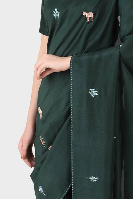 Shop_Laite_Green Silk Embroidery Animal Resham Hand Saree _at_Aza_Fashions