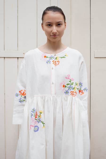White midi dress featuring placed multicolour thread embroidered floral and tuberose bouquet patterns highlighted by contrast running stitch