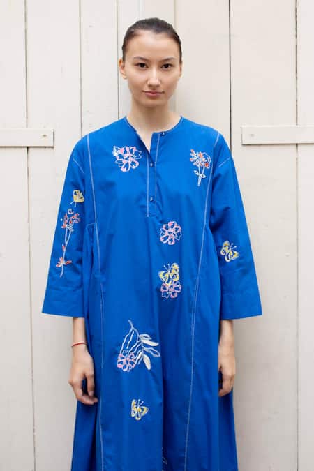 Cobalt blue midi dress featuring scattered multicolour thread embroidered butterfly and floral motifs