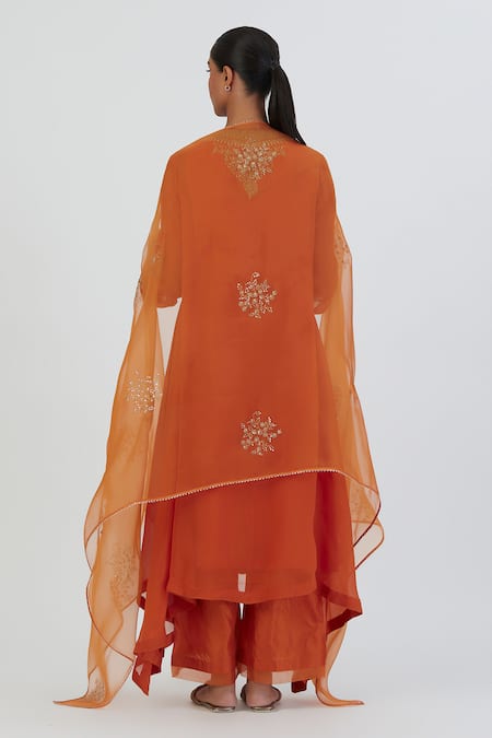 Orange Organza Embroidered Thread Ira Floral Cluster Dupatta