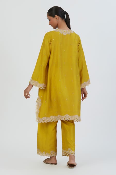 Lime yellow kurta featuring thread embroidery and a V neck. Paired with matching pants.