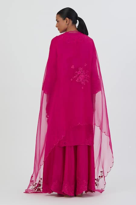 Intricate floral thread embroidery along the borders, Scalloped edges for a refined finish, Lightweight and sheer organza fabric