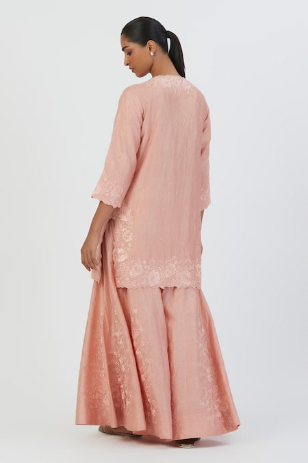 Salmon pink kurta featuring three fourth sleeves with cut work border and wild bloom embroidery on the neckline, sleeves, and hem. Paired with a matching tonal floral embroidered sharara.