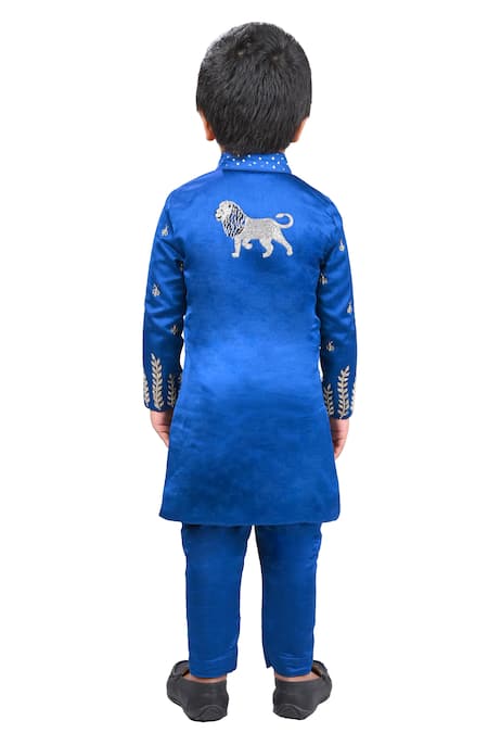 Blue satin raw silk sherwani featuring jungle themed animal motif embroidery. Paired with matching pant and adorned with thread and sequin work.