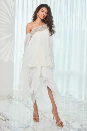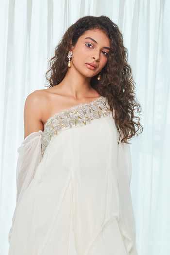 White Silk Organza Embroidered Floral Asymmetric One Shoulder Top And Skirt Set