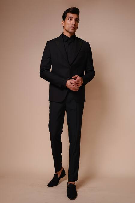 Black tuxedo with lapel collared neckline. Paired with tonal shirt & trousers.