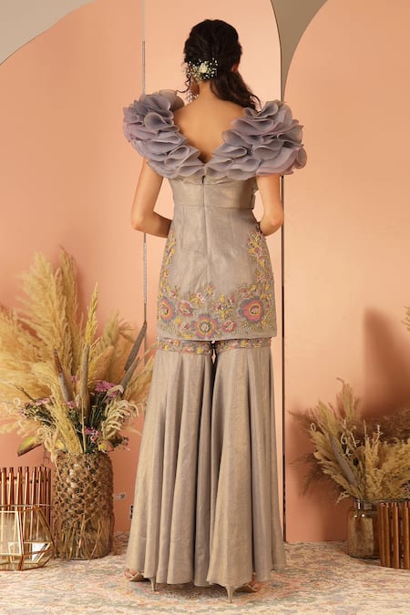 Grey short tunic with layered ruffle bodice & floral embroidered motifs. Paired with tiered & embroidered sharara.