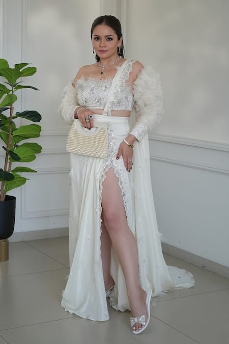 Ivory pre-draped saree made of Italian satin, featuring intricate embellishments. Paired with a padded blouse and gloves, this set offers a complete look.