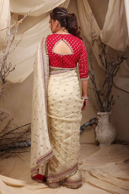 Ivory saree featuring all over florin zari-sequin floret embroidery and kiran lace border embellishments. Paired with a three fourth sleeves blouse adorned with floret zari woven motifs.