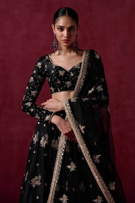 Buy_Lashkaraa_Black Satin, Crepe Sequins, Zari, Embroidery Floral Butta Lehenga Set _at_Aza_Fashions