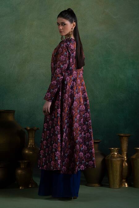Multi color jacket featuring full sleeves and all over bloomy woven detailing. Paired with a floral thread, zari, and sequin embroidered padded bustier along with a dark blue draped skirt.