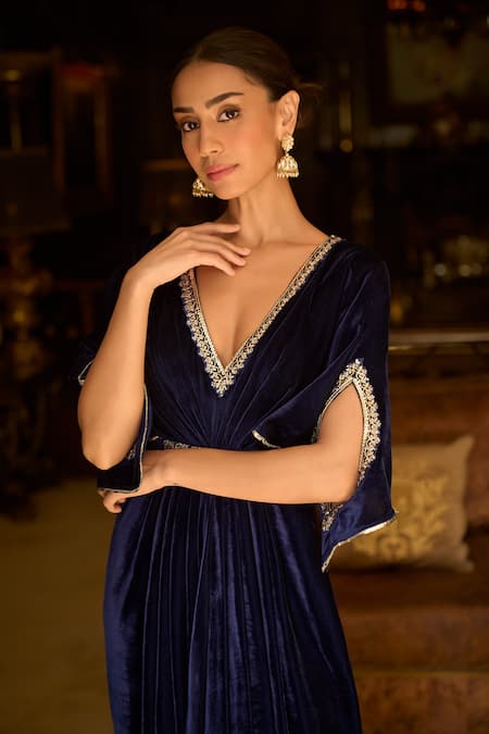 Blue velvet kaftan featuring V neck, asymmetric sleeves, and intricate thread, sequin, and stone embroidery
