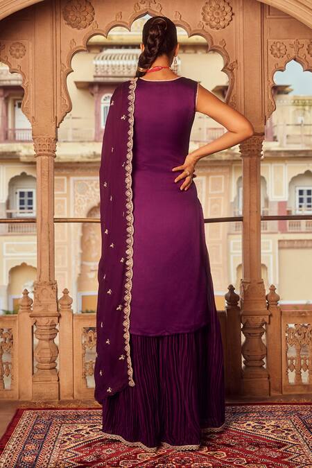 Wine purple A-line chiffon kurta featuring crest bloom embroidery with thread, zari, beads, and sequin highlights. Paired with a pleated flared palazzo and an embroidered dupatta.