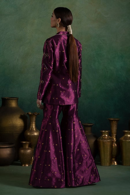 Purple Brocade, Satin Sequins, Zari Crest Bloom Woven Blazer And Gharara Set