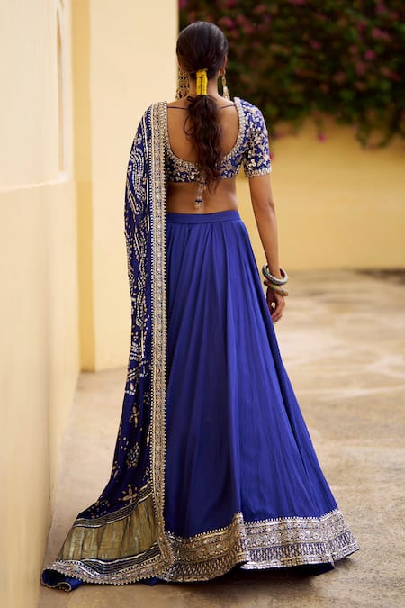 A royal blue pure modal gazi silk lehenga skirt features a cancan, shantoon attached lining, and all-over sequins, zari, cording, and handwork embellishments on the hem. It is paired with a pure modal gazi silk blouse with shantoon attached lining, pads, and matching sequins, zari, cording, and handwork embroidery. The ensemble includes a royal blue pure bandhani modal gazi silk dupatta with full handwork embellishments.