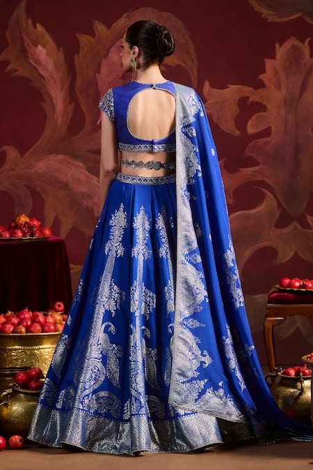 Royal blue lehenga featuring intricate embroidery with sequins, zari, and handwork embellishments. Set includes a matching blouse with attached padding and a dupatta.
