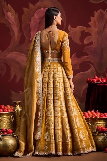 Mustard yellow lehenga featuring intricate sequins and zari embroidery. Paired with a silk blouse and tissue dupatta, both lined with crepe.