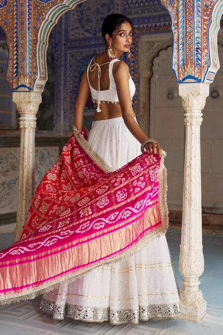 White Georgette, Modal, Silk, Satin Lucknowi Lehenga With Bandhani Dupatta