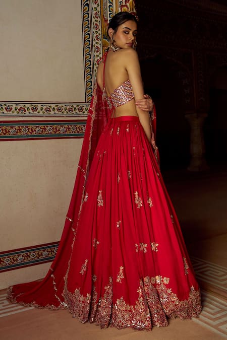 Red Silk, Net Embroidery, Zari, Mirrors, Sequins Halter Neck Lehenga Set